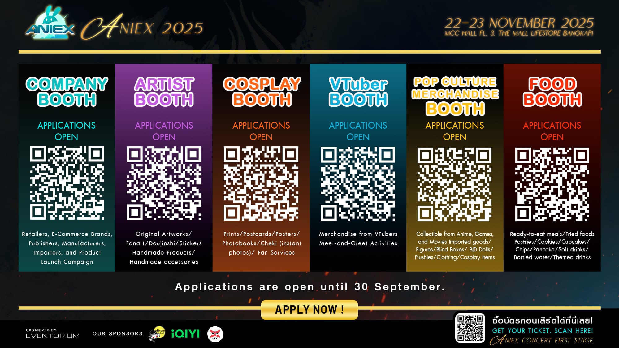 - AniEx opened booth registration for AniEx2025. They have opened registration slots for companies, artists, cosplayers, vtubers, merchandise, and food stops. (@AniEx_event)
